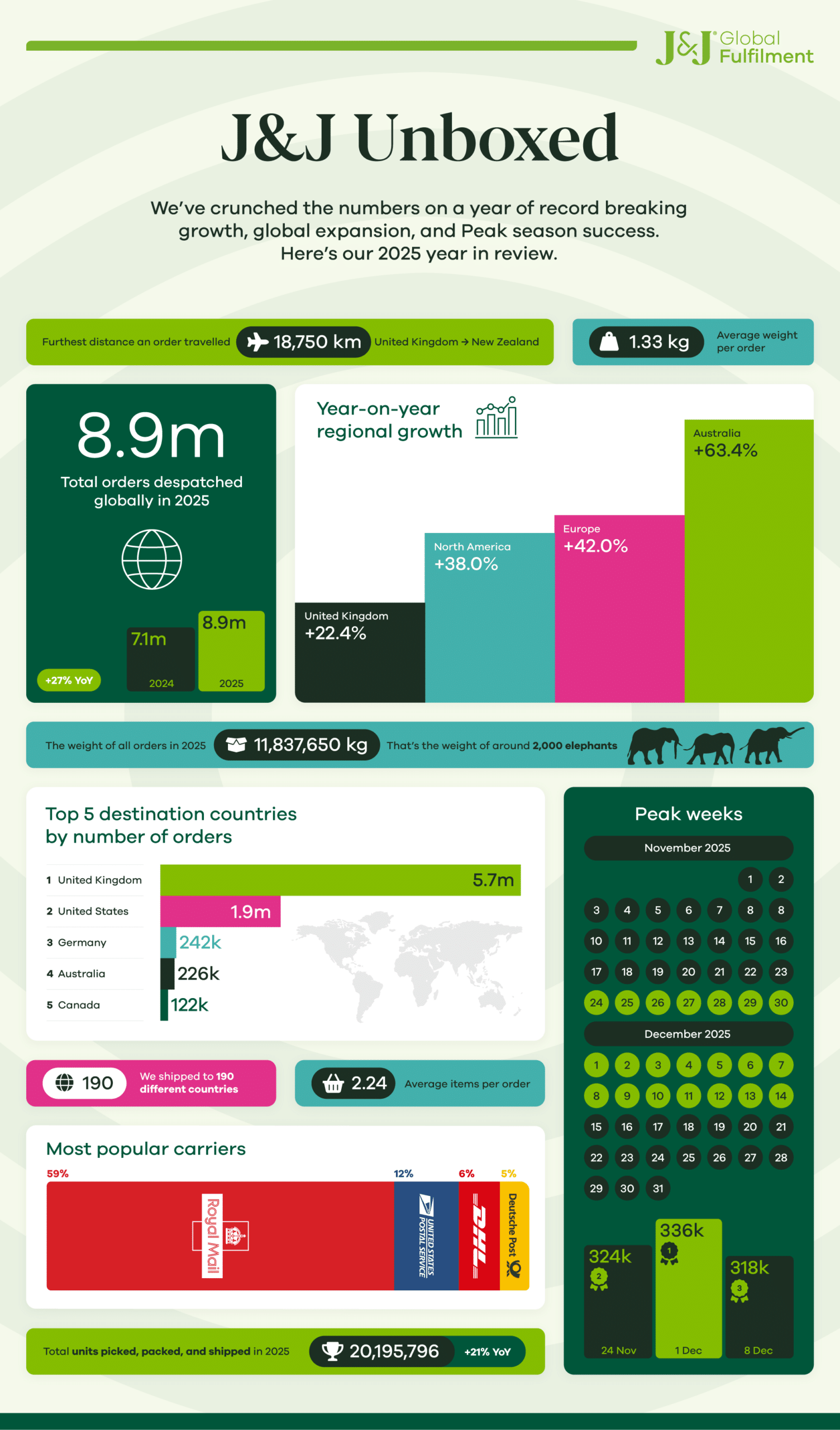 From total orders dispatched and most-used carriers to top destination countries and the combined weight shipped across our global fulfilment network, there’s a lot to unbox.